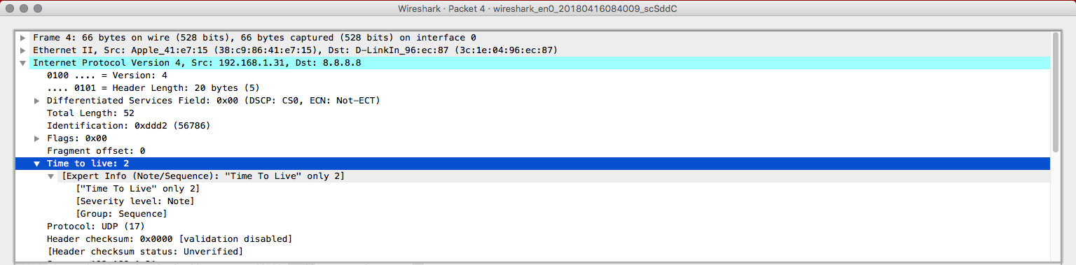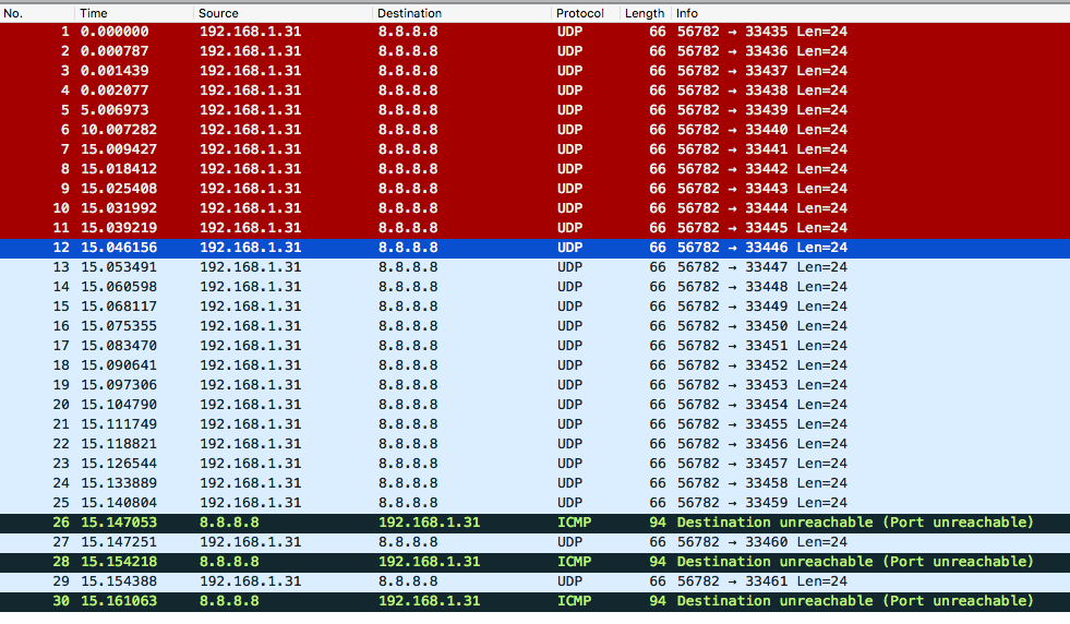 Have you ever asked how traceroute works? Let's find out. For this, I've installed Wireshark on my personal computer and started to capture expression "host 8.8.8.8". It's going to filter any packet which destination or source host is 8.8.8.8.