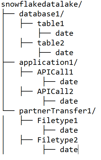 Being a multi-cloud product, Snowflake supports AWS S3, Google Cloud Storage, Azure Blob Storage, or Azure Data Lake. While not 100 percent necessary, odds are very high that you will end up using cloud storage as a landing pad for data, long term archive, or raw data lake as well. Meaning, your Snowflake account will be interacting regularly with your cloud storage through a feature Snowflake calls an "external stage." The actual implementation is very neat, and once it's configured, it's transparent to use the cloud storage, and not too hard to swap one cloud storage for another (in the event you want to migrate to a different cloud or for DR). This means that once again, it's better to get this properly setup and configured before you go live with your data platform. Below is a common folder structure we recommend for clients. At a minimum, we recommend this breakdown to the date level. Depending on requirements there could be more levels down such as "pending" or "processed" folders or more. Using the cloud provider's own security model you can protect the top-level folders (e.g. for a specific app or ETL tool) and the subfolders (e.g. read-only access to the "processed" folder). Here's an example:
