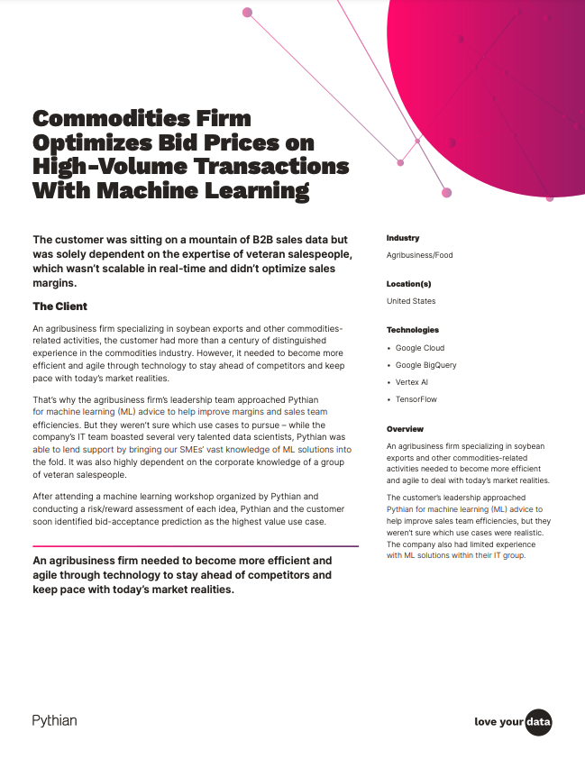 That’s why the agribusiness firm’s leadership team approached Pythian for machine learning (ML) advice to help improve margins and sales team efficiencies. But they weren’t sure which use cases to pursue – while the company’s IT team boasted several very talented data scientists, Pythian was able to lend support by bringing our SMEs’ vast knowledge of ML solutions into the fold. It was also highly dependent on the corporate knowledge of a group of veteran sales people.