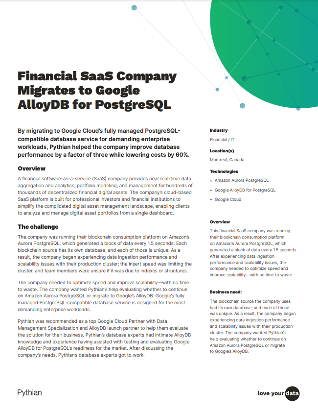 The company needed to optimize speed and improve scalability—with no time to waste. The company wanted Pythian’s help evaluating whether to continue on Amazon Aurora PostgreSQL or migrate to Google’s AlloyDB. Google’s fully managed PostgreSQL-compatible database service is designed for the most demanding enterprise workloads.
