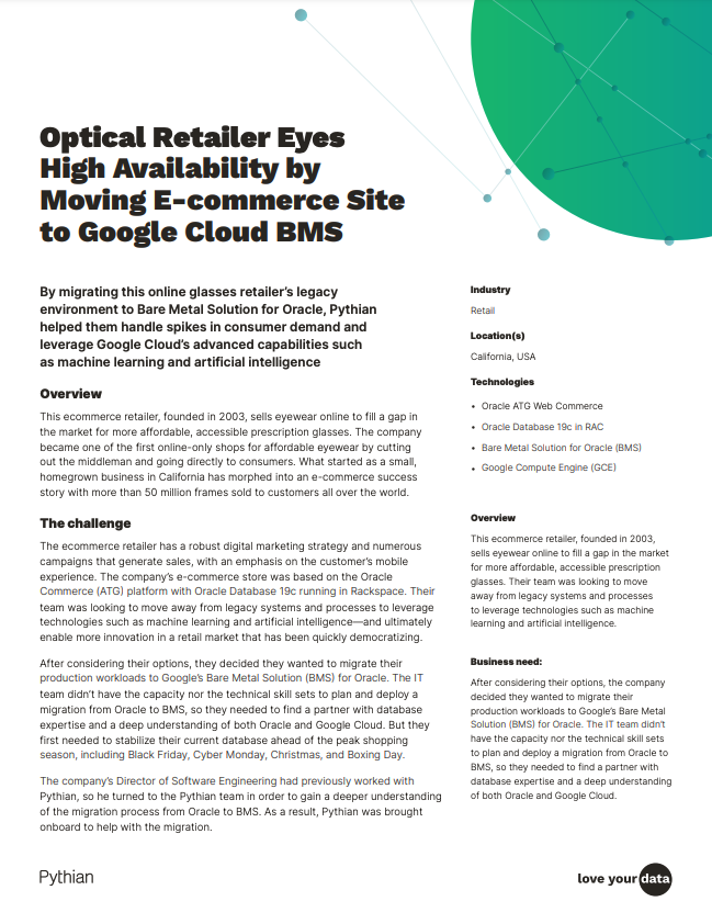 Online optical retailer turns to Pythian to migrate legacy Oracle systems and unlock modernization capabilities with Google Bare Metal Solution.