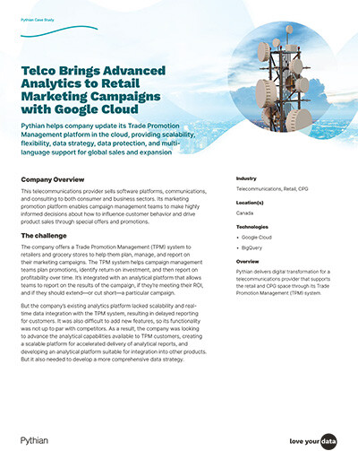 A leading Canadian telecommunications provider, offering a valuable Trade Promotion Management (TPM) system to retailers and grocery stores, faced a major analytics bottleneck. Their existing platform lacked the scalability and real-time data integration needed to support the TPM system, resulting in significant delays in crucial marketing campaign reporting for their customers. Recognizing that slow data meant slow sales, the company partnered with Pythian for a strategic digital transformation. Pythian's experts utilized a phased approach to design and implement an advanced analytics platform on Google Cloud, leveraging BigQuery.